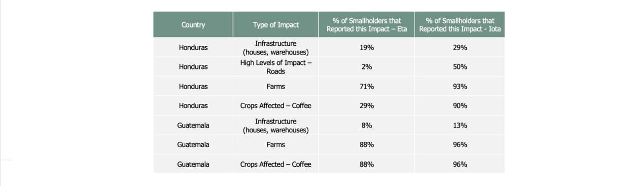 In comparison to Guatemala, the damage caused by Iota in Honduras was much stronger due to the storm’s path. After Iota, the number of smallholder families that reported infrastructural damage and a higher level of destruction in roads increased by 10% and 48% respectively. The same applies to the impacts on agriculture and crops production. After hurricane Eta, 29% of the surveyed smallholders reported that none of their crops were damaged. This number decreased to 7% after Hurricane Iota, meaning that 93% of smallholders had at least one of their crops affected. 90% of smallholder families have reported damage in their coffee farm, including a high percentage of dropped cherries, defoliation, and landslides that have washed entire farms away. Households were damaged, and food insecurity continues to be a major worry due to the impacts in coffee, timber and basic grains.
