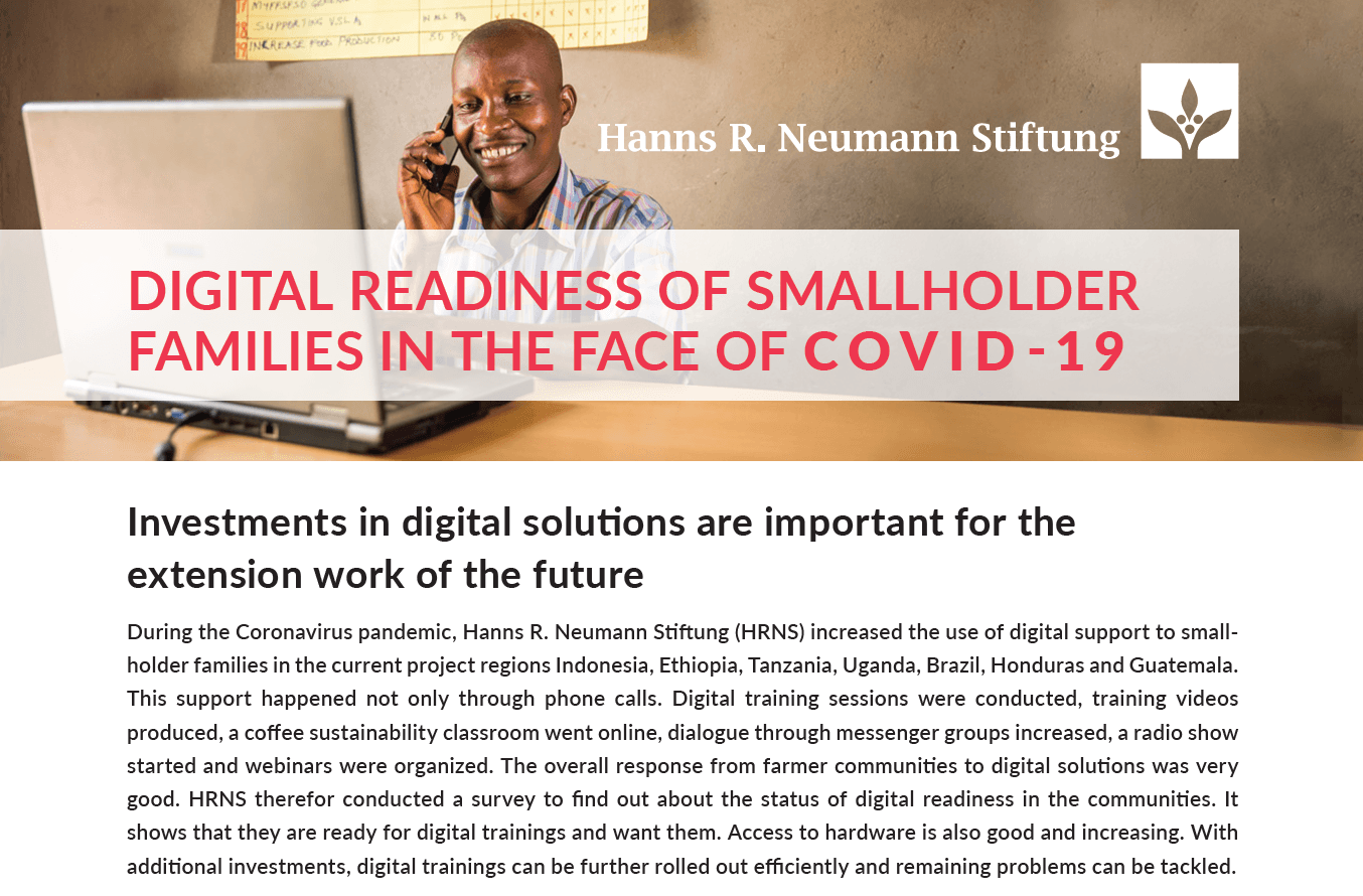 During the Coronavirus pandemic, Hanns R. Neumann Stiftung (HRNS) increased the use of digital support to smallholder coffee farmer families in project regions. This support was not only through phone calls. Digital training sessions were conducted, training videos produced, a coffee sustainability classroom went online, dialogue through messenger groups increased, a radio show started and webinars were organized.