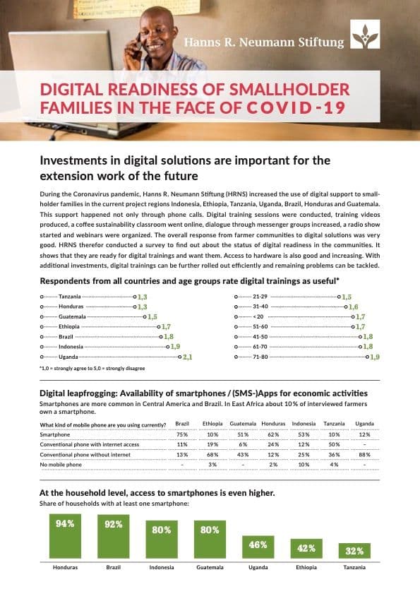 The overall response from farmer communities to digital solutions was very good. HRNS therefor conducted a survey in the current project regions Ethiopia, Uganda, Tanzania, Indonesia, Brazil, Guatemala and Honduras to find out about the status of digital readiness in the communities.